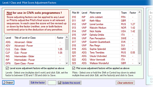 Setting a 'Score Adjustment Factor' for all Pilots in one Level Select a Level / Class and click the 'Edit the factor' button. The edit text-box will display the factor, starting at "1.00" or the factor that is already set. The factor can now be revised between a minimum of 0.50 and a maximum of 1.50 and updated with the Update button. |