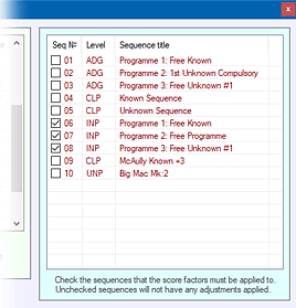 'Save changed Sequence settings' to store this information. Now when you calculate some Results and any of the above Level and/or Pilot Score Adjustment Factors are set, the adjustments will be restricted to the sequences with their check-box ticked. The above three features can be used in any combination to provide a wide range of solutions where it is necessary to precisely factor some Pilots scores either up or down within a controlled range of conditions. |